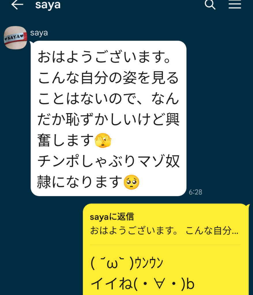 しばらくしてSayaから返信が入る。「katsuさんにお会いできるのがますます楽しみになってきました!画像の女性の方、素敵です!!口イキなんて初めて聞きましたけど、私もできるようになりたいです。全身性感帯にして下さい。」